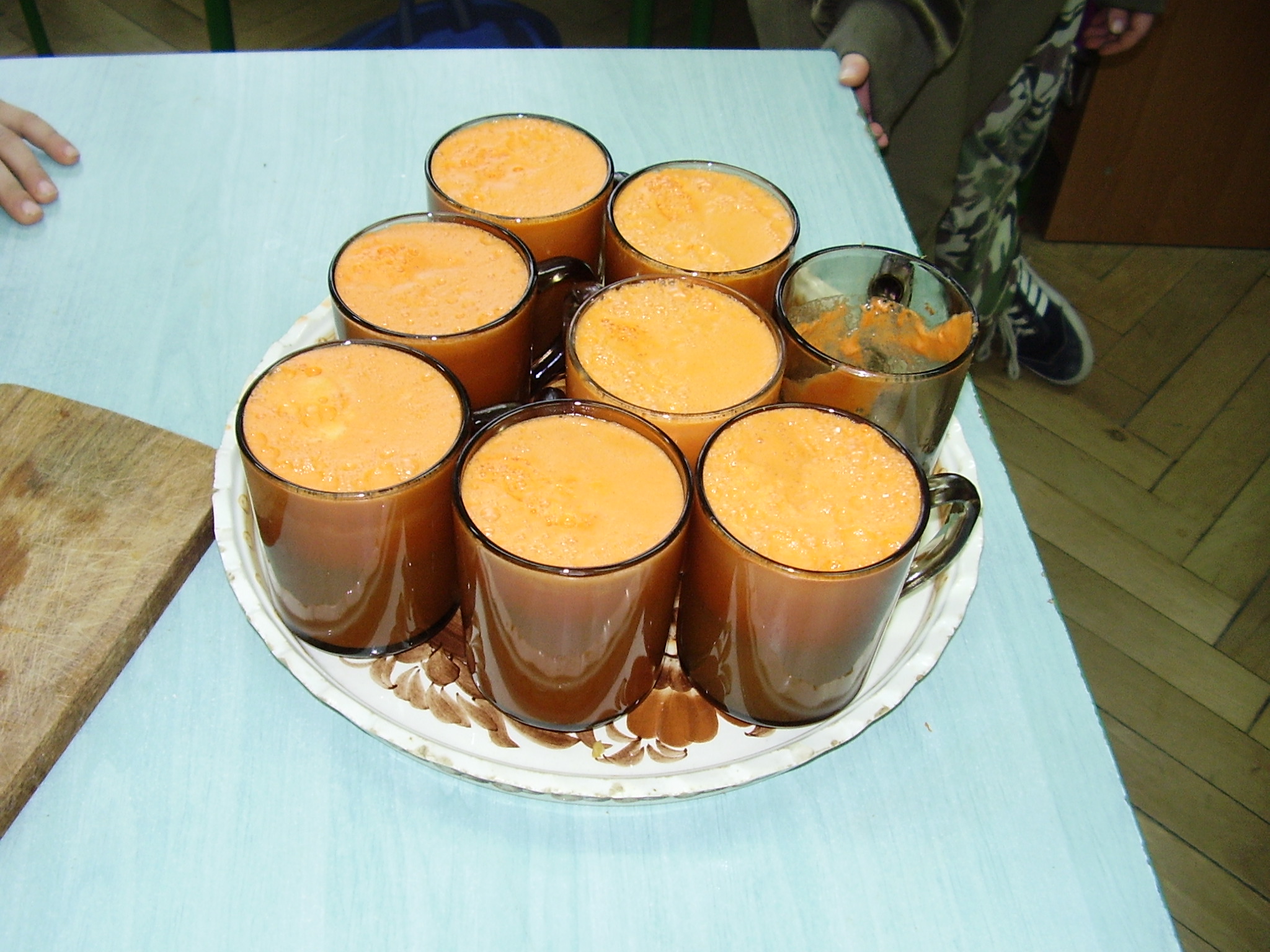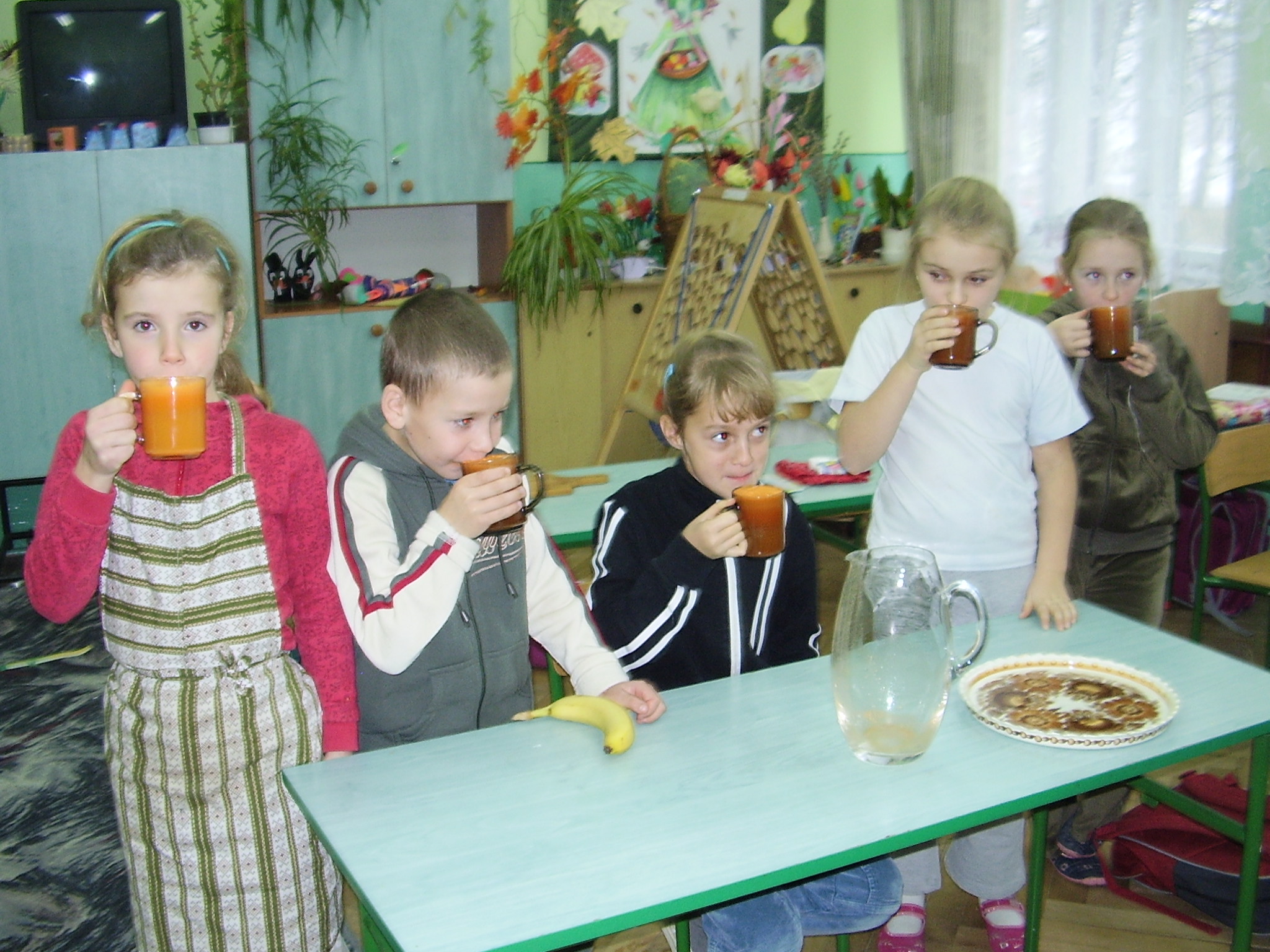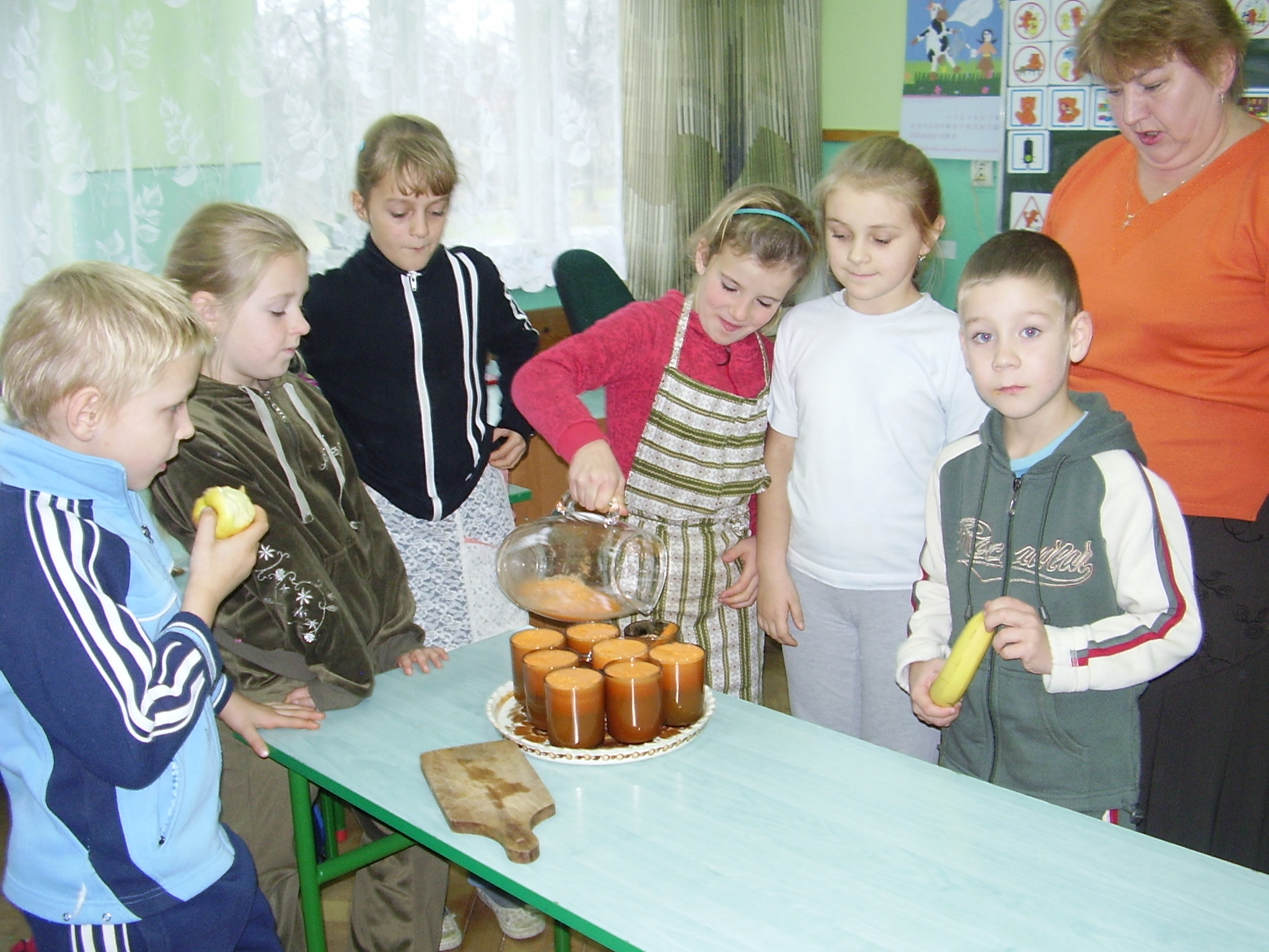 Dzieci na lekcję przyniosły marchewki, jabłka, nóż, fartuszek i deseczkę. Zadaniem nauczyciela było zaś przygotowanie sokowirówki, szklanek i dzbanka. Prowadząca zajęcia pani Barbara Drozd przed przystąpieniem do wykonania soku wykorzystała przyniesione przez dzieci warzywa i owoce do wspólnego przeliczania oraz układania treści zadań tekstowych. Po czym zaprezentowała sokowirówkę omawiając jej przeznaczenie, budowę oraz zasady posługiwania się nią bezpiecznie.